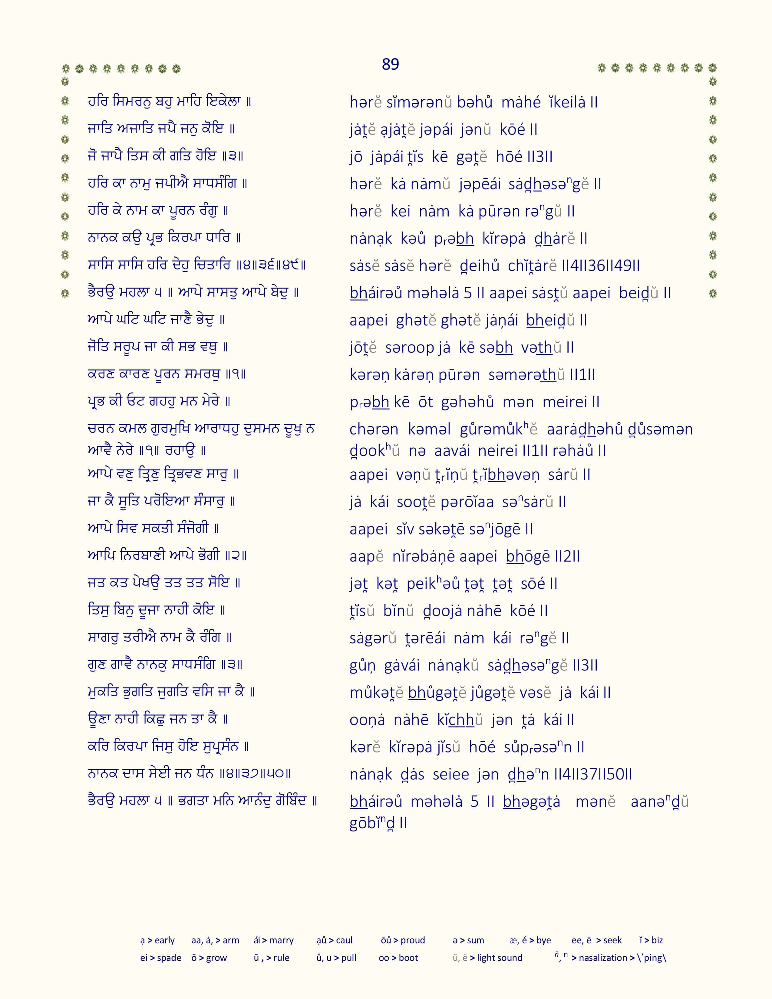 Detailed line by line color-coded transliteration for pǝnnȧ 1101-1150 of Sri Guru Granth Sahib. Enhanced readability and pronunciation accuracy for the sacred Gůrǝbȧņē text.